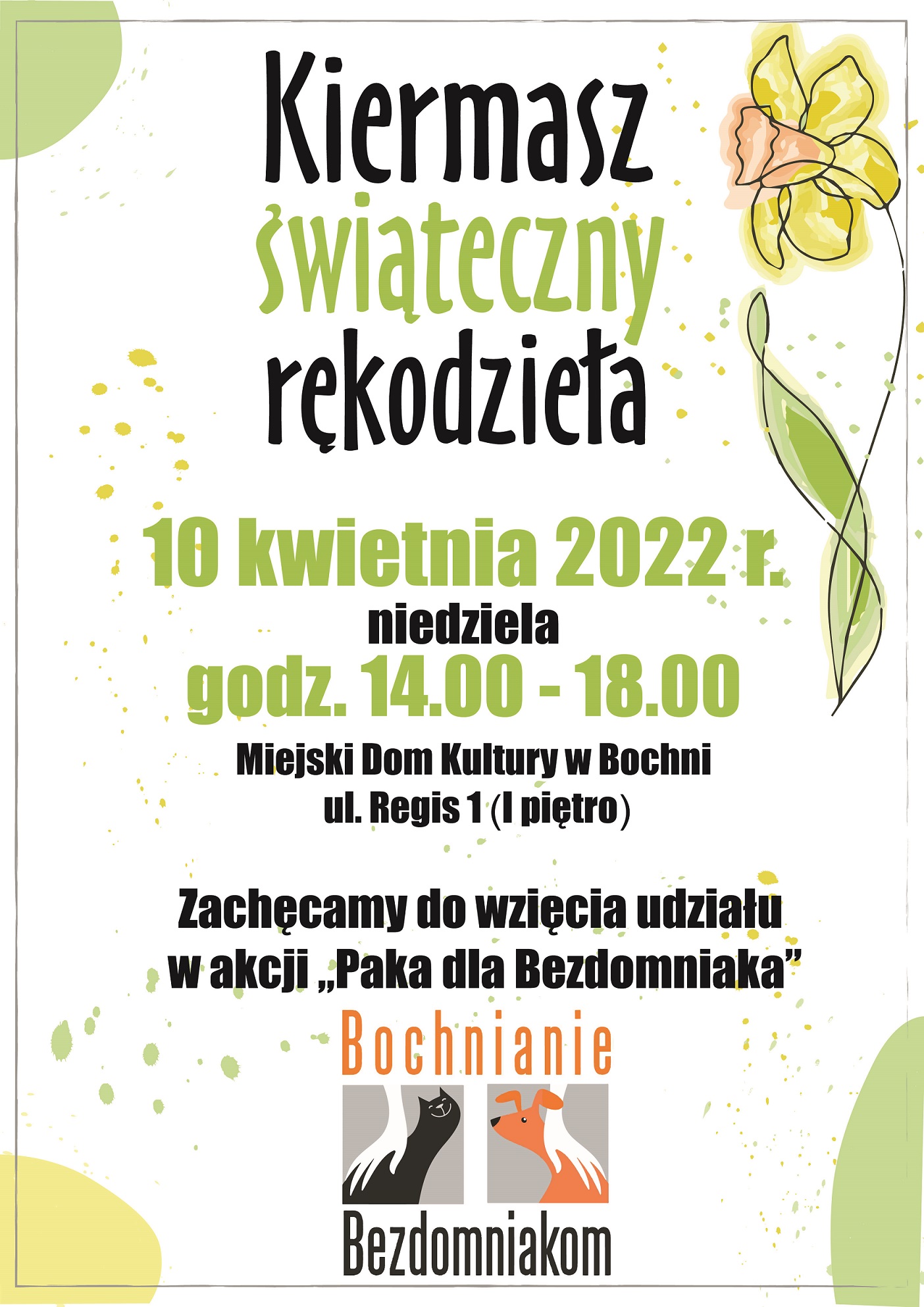 Kiermasz świąteczny rękodzieła, z którego dochód przeznaczony zostanie na pomoc bezdomnym zwierzętom objętym pomocą stowarzyszenia „Bochnianie Bezdomniakom” odbędzie się w Miejskim Domu Kultury w Bochni, w niedzielę 10 kwietnia w godzinach 14.00 – 18.00.