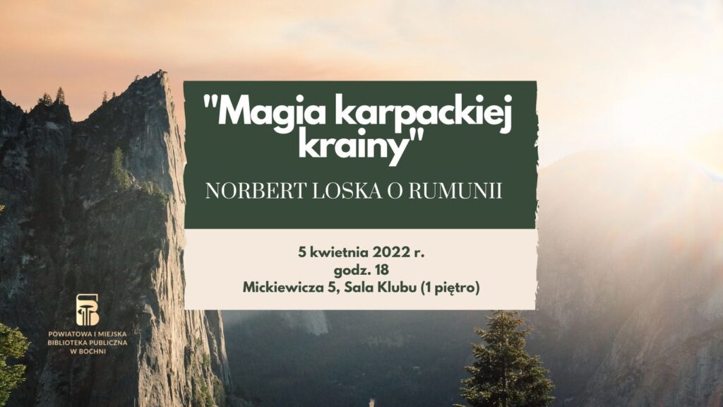 Powiatowa i Miejska Biblioteka Publiczna w Bochni zaprasza na spotkanie „Magia karpackiej krainy” czyli opowieść Norberta Loski o wyprawie do Rumunii. To kolejna propozycja Biblioteki w cyklu „Bochniacy z pasją”. Spotkanie odbędzie się 5 kwietnia 2022 r. o godz.18.00, w sali klubu Biblioteki, ul. Mickiewicza 5.