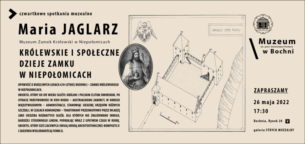Muzeum im. prof. Stanisława Fischera w Bochni zaprasza w czwartek o godz. 17.30 na Czwartkowe Spotkanie Muzealne, podczas którego Maria Jaglarz z Muzeum Zamku Królewskiego w Niepołomicach opowie o „Królewskich i społecznych dziejach Zamku w Niepołomicach”.