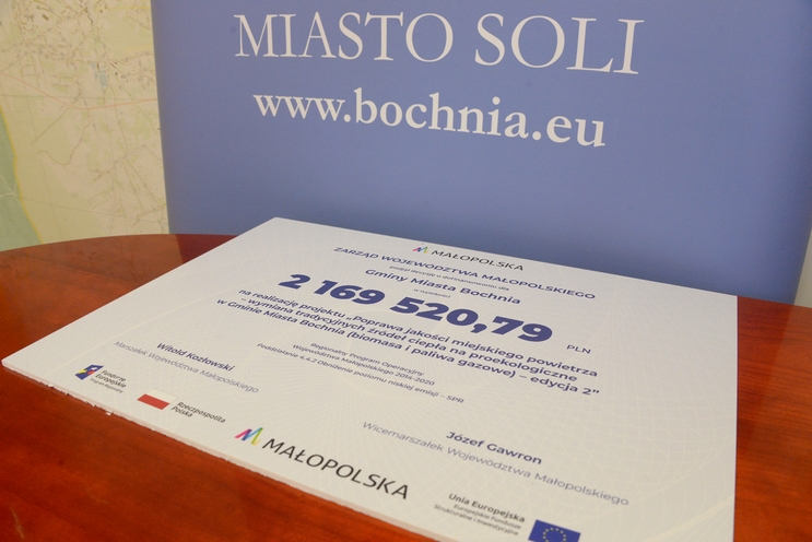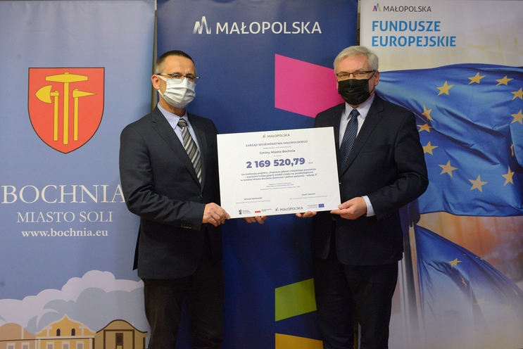 Józef Gawron przekazał wiceburmistrzowi Bochni symboliczny czek na realizację projektu „Poprawa jakości miejskiego powietrza – wymiana tradycyjnych źródeł ciepła na proekologiczne w Gminie Miasta Bochnia (biomasa i paliwa gazowe) – edycja 2”. Bochnia, na wniosek złożony w 2018 r., otrzymała blisko 2,2 mln dotacji przy wkładzie własnym 33 tys. zł.