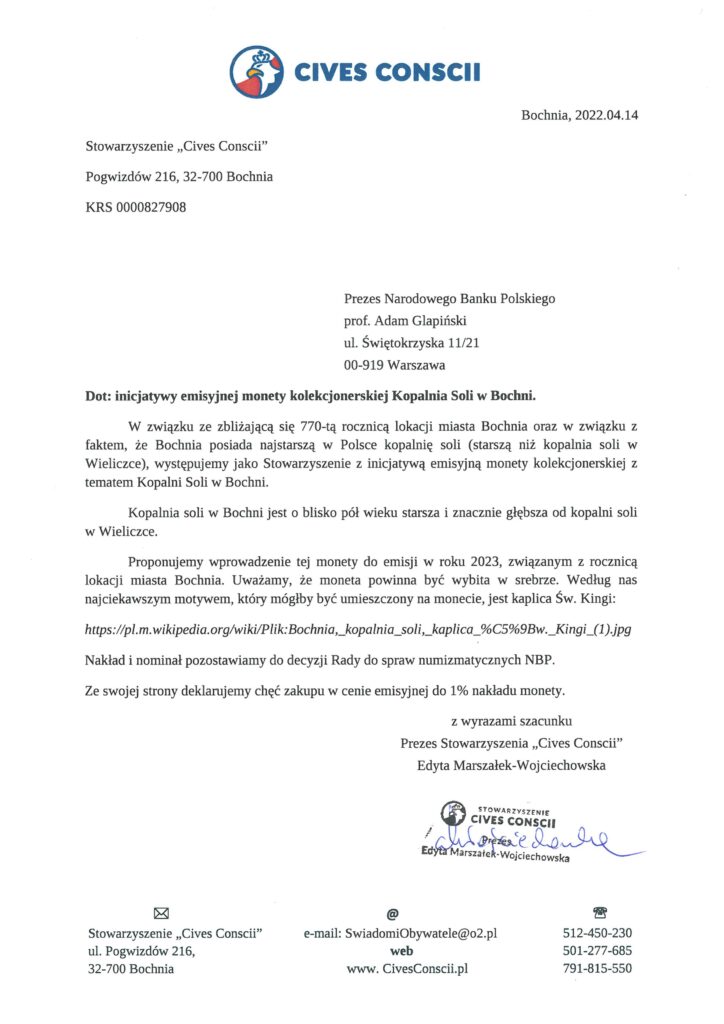 Edyta Marszałek-Wojciechowska prezes Stowarzyszenia zwróciła się do prof. Adama Glapińskiego Prezesa Narodowego Banku Polskiego z prośbą wydania monety kolekcjonerskiej Kopalnia Soli w Bochni. W przyszłym roku przypada okrągła 770. rocznica lokacji solnego grodu.