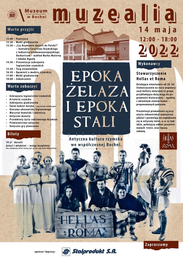 Muzeum im. prof. Stanisława Fischera w Bochni zaprasza w sobotę, 14 maja na tegoroczne Muzealia pod hasłem „Epoka żelaza i epoka stali. Antyczna kultura rzymska we współczesnej Bochni”, organizowane we współpracy ze Stowarzyszeniem Hellas et Roma, działającym na rzecz popularyzacji kultury antycznej.