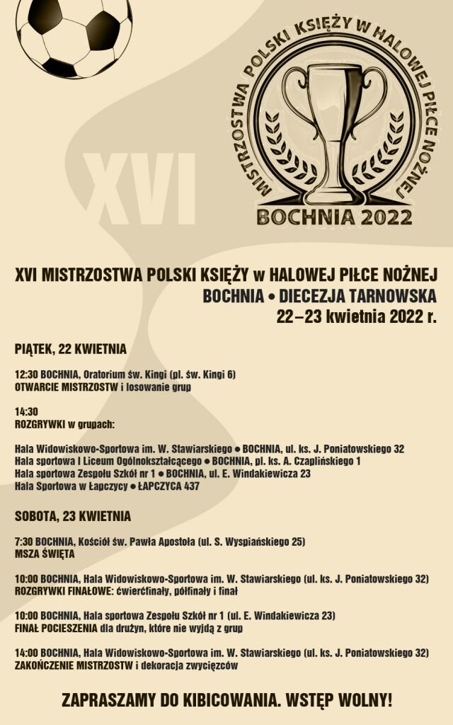 Mistrzostwa zainauguruje spotkanie zaplanowane w piątek w bocheńskim Oratorium św. Kingi. Jutro o godz. 12:30 nastąpi uroczyste otwarcie zawodów oraz rozlosowanie grup turniejowych. Dwie godziny później usłyszymy pierwsze gwizdki sędziowskie rozpoczynające grupowe zmagania, do których zgłosiło się ostatecznie 17 reprezentacji diecezjalnych.