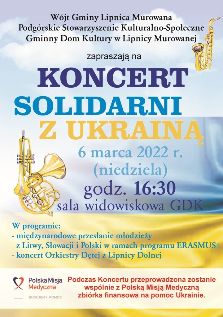 W niedzielę – 6 marca – Wójt Gminy Lipnica Murowana, Podgórskie Stowarzyszenie Kulturalno-Społeczne oraz Gminny Dom Kultury w Lipnicy Murowanej serdecznie zapraszają na godzinę 16:30 do sali widowiskowej GDK na koncert „Solidarni z Ukrainą”.