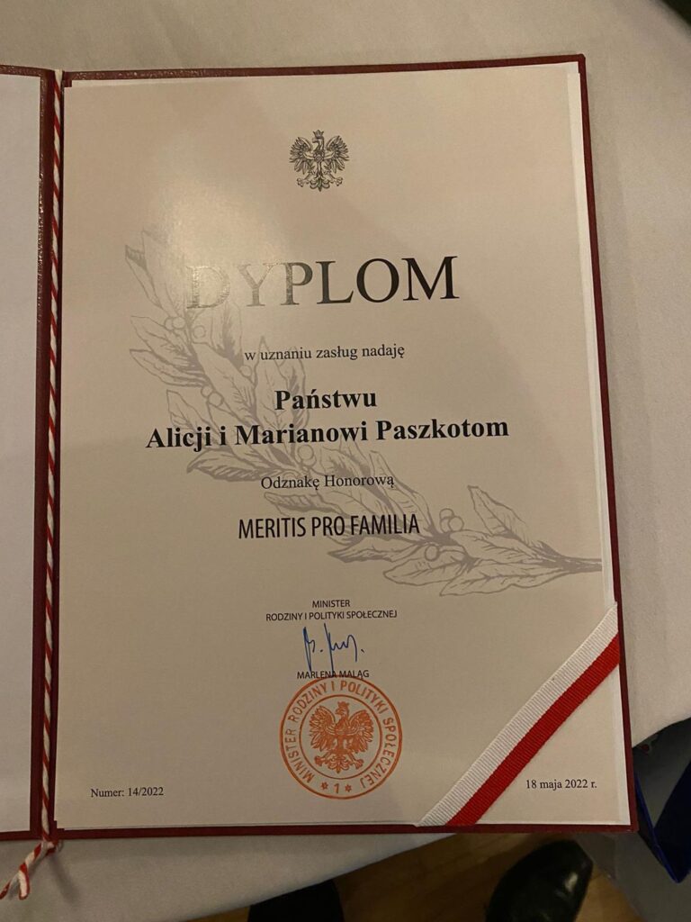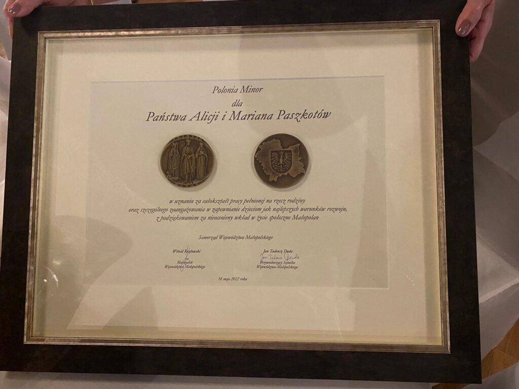 W uznaniu tych zasług Państwo Paszkowie otrzymali od Minister Rodziny i Polityki Społecznej Marleny Maląg Odznakę Honorową Meritis Pro Familia oraz od Marszałka Województwa Małopolskiego Witolda Kozłowskiego Nagrodę Polonia Minor.