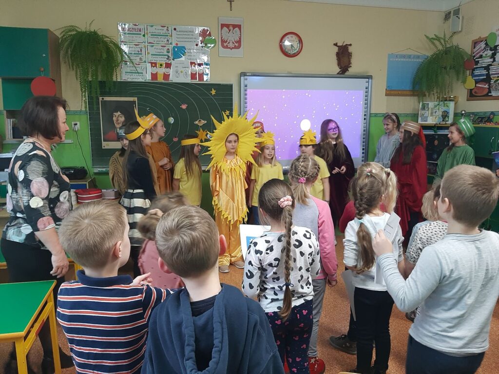 Dzieci rozpoczęły swoją kosmiczną przygodę od uczestnictwa w zajęciach obecnych trzecioklasistów wraz z ich wychowawcami. Najpierw przygotowały kosmiczną rakietę, odpowiadając na pytania w międzyplanetarnym quizie i malując pojazd z klasą III B. Następnie rakieta wystartowała do Układu Słonecznego, gdzie żywe „planety”, czyli uczniowie klasy III A, zaśpiewali piosenkę, zaprezentowali wiersz i zaprosili dzieci do ciekawych stacji zadaniowych oraz tablicy interaktywnej.