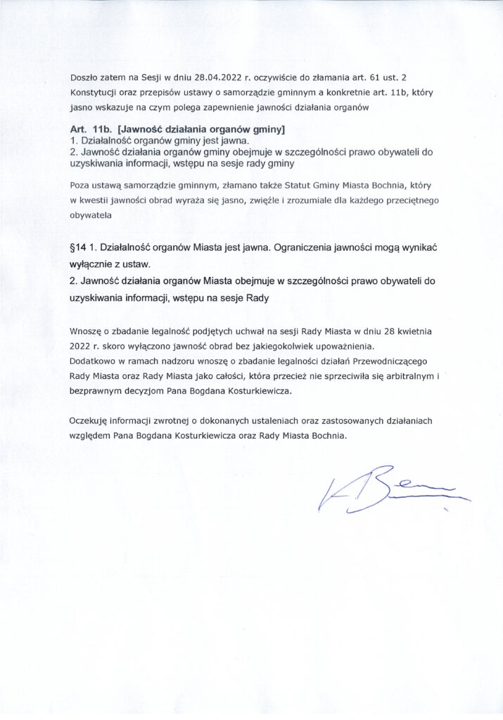 Według posła Konrada Berkowicza w Bochni doszło do złamania art. 61. ust. 2 Konstytucji oraz przepisów ustawy o samorządzie gminnym. Dlatego poprosił on wojewodę o zbadanie legalności podjętych uchwał na sesji Rady Miasta w dniu 28 kwietnia 2022 r.