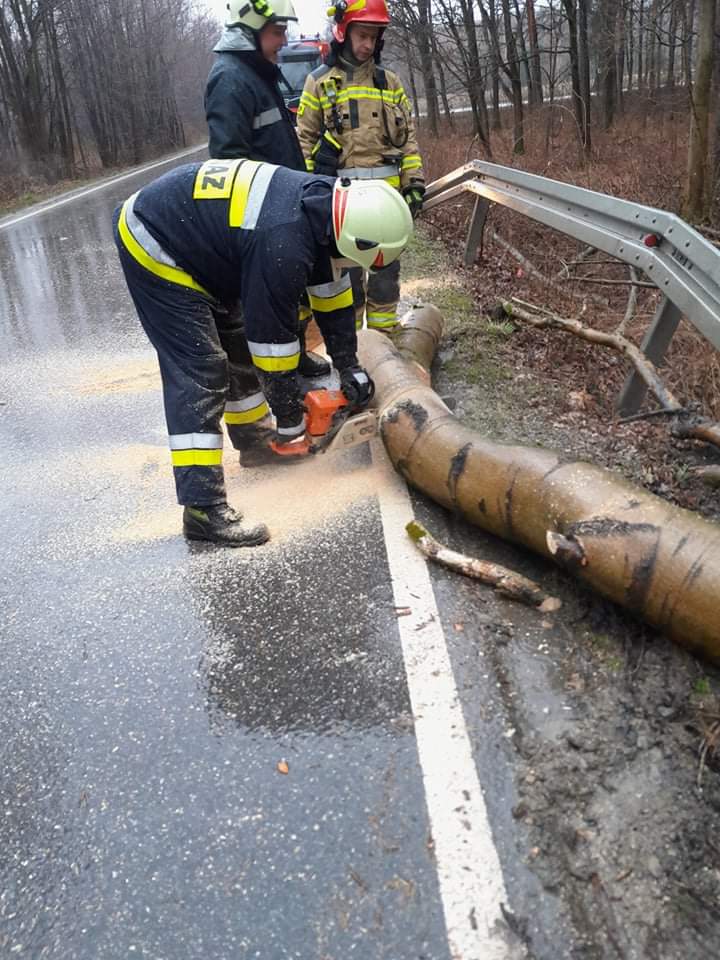 W Maszkienicach, Domosławicach, Jastwi, Brzesku i Gosprzydowej strażacy z KP PSP wsparci przez druhów OSP usuwali powalone przez wiatr drzewa.