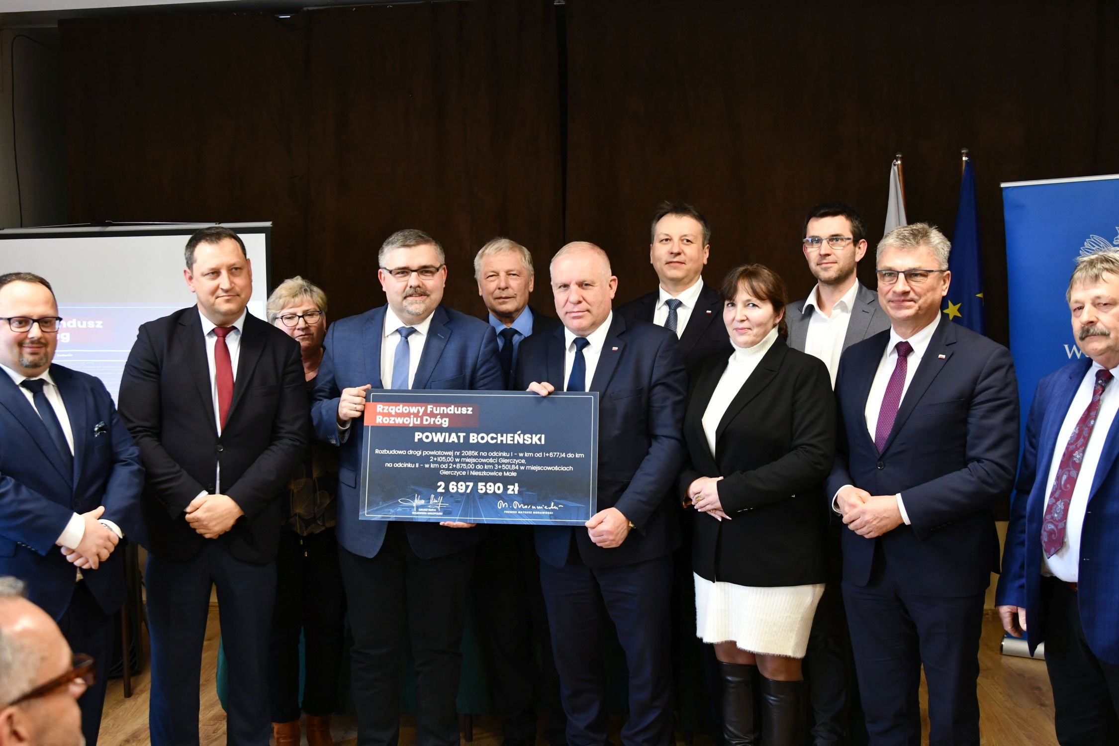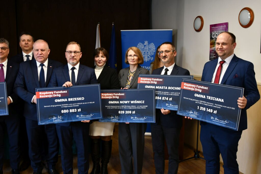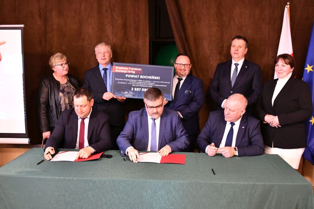 Prawie 2,7 miliona złotych dofinansowania otrzymał Powiat Bocheński z Rządowego Funduszu Rozwoju Dróg na rozbudowę drogi powiatowej w Gierczycach i Nieszkowicach Małych. W piątek starosta Adama Korta w obecności członków Zarządu Powiatu oraz radnych powiatowych odebrał z rąk wicewojewody małopolskiego Ryszarda Pagacza symboliczny czek na realizację tego zadania.