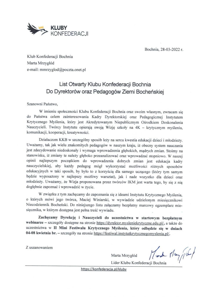 Przedstawiciele bocheńskiego klubu Konfederacji wystosowali list do dyrektorów i nauczycieli z powiatu bocheńskiego. Chcą ich zachęcić do dyskusji na temat systemu nauczania.