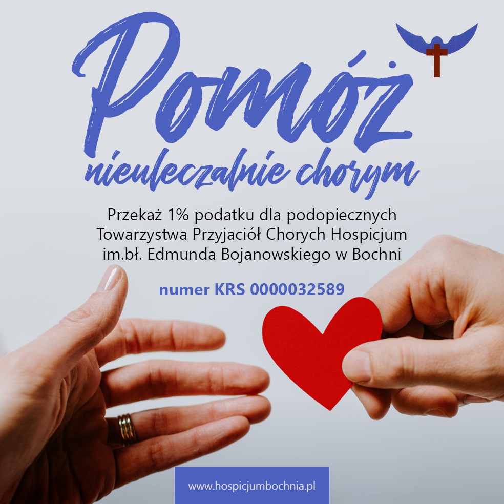 I ty możesz wspomóc podopiecznych bocheńskiego hospicjum, przekazując 1 % podatku. Towarzystwo Pomocy Chorym – Hospicjum im. Bł. Edmunda Bojanowskiego w Bochni posiada statut instytucji pożytku publicznego, zatem na jego potrzeby można przekazywać odpis podatku, podając przy rocznym rozliczeniu numer: KRS0000032589.