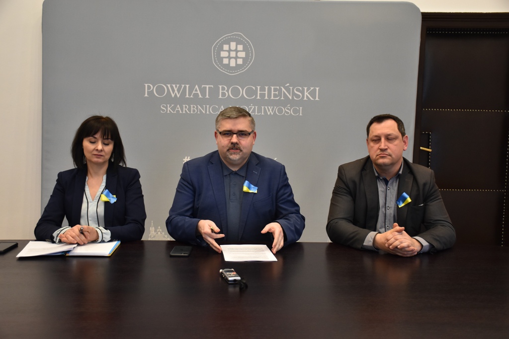 Dziś o godzinie 13.30 w budynku Starostwa Powiatowego w Bochni odbyła się konferencja prasowa starosty Adama Korty, wicestarosty Ryszarda Drożdżaka oraz Marii Jachym dyrektor Wydziału Spraw Społecznych i Zarządzania Kryzysowego. Spotkanie dotyczyło koordynacji działań pomocowych dla Ukrainy organizowanych na terenie powiatu bocheńskiego.