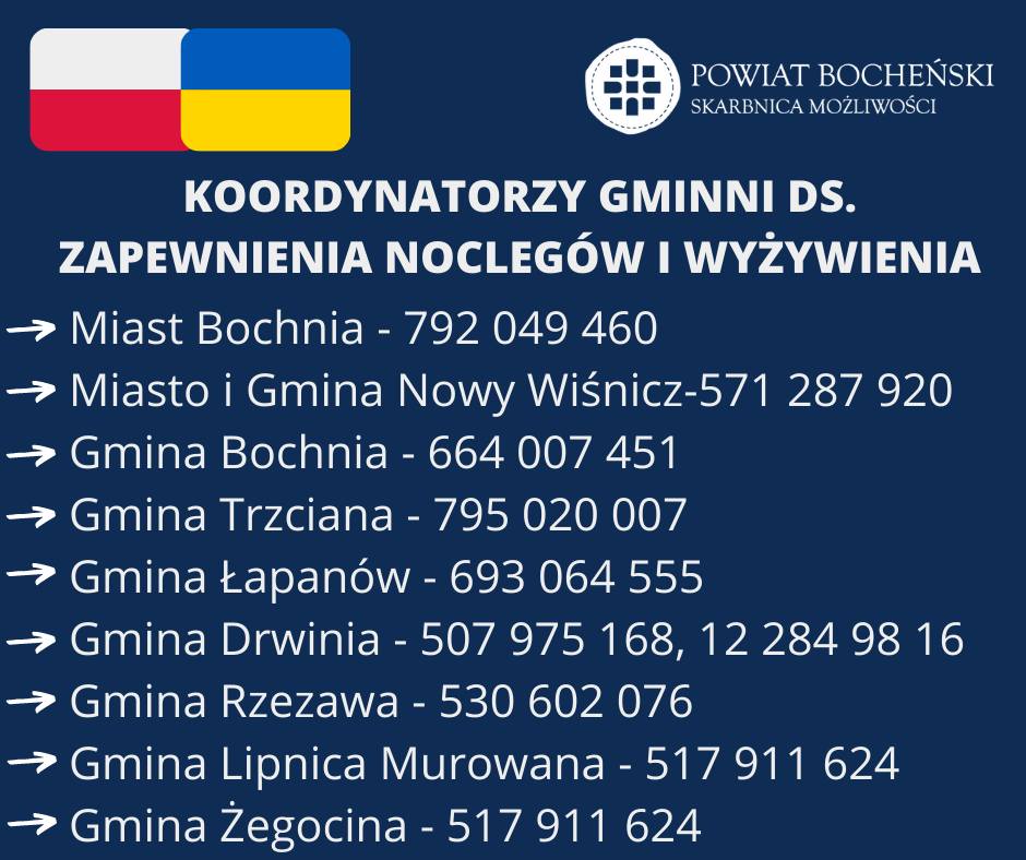 W Powiecie Bocheńskim uruchomiony zostanie Powiatowy Magazyn Pomocy, będzie to magazyn CENTRALNY do którego trafiać mają uprzednio zewidencjonowane dary, ze wszystkich zbiórek prowadzonych na terenie całego powiatu. Magazyn ten będzie mieścił się przy Centrum Kształcenia Zawodowego i Ustawicznego w Łapanowie. Magazyn będzie przyjmował dary w godzinach 8:00 -20:00. Telefon będzie czynny w godzinach przyjmowania 784 922 139.
