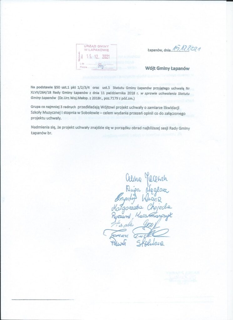 – Uchwała została podjęta przed Nowym Rokiem w dniu 29 grudnia 2021 r. w trybie zdalnym, to znaczy bez możliwości udziału publiczności, … to daje do myślenia, i… tryby maszyny likwidacyjnej ruszyły. Osobiście nie rozumiem takiej decyzji, mimo, że dobrze znanym jest mi fakt słabej kondycji finansowej gminy Łapanów. Niemniej jednak problemy można rozwiązywać inaczej, a nie w tak radykalny sposób niszcząc 10-letni dorobek szkoły i 20-letnią pracę ludzi, którzy budowali Orkiestrę Dętą Sobolów, a na jej kanwie szkołę muzyczną – podkreśla Ryszard Drożdżak.