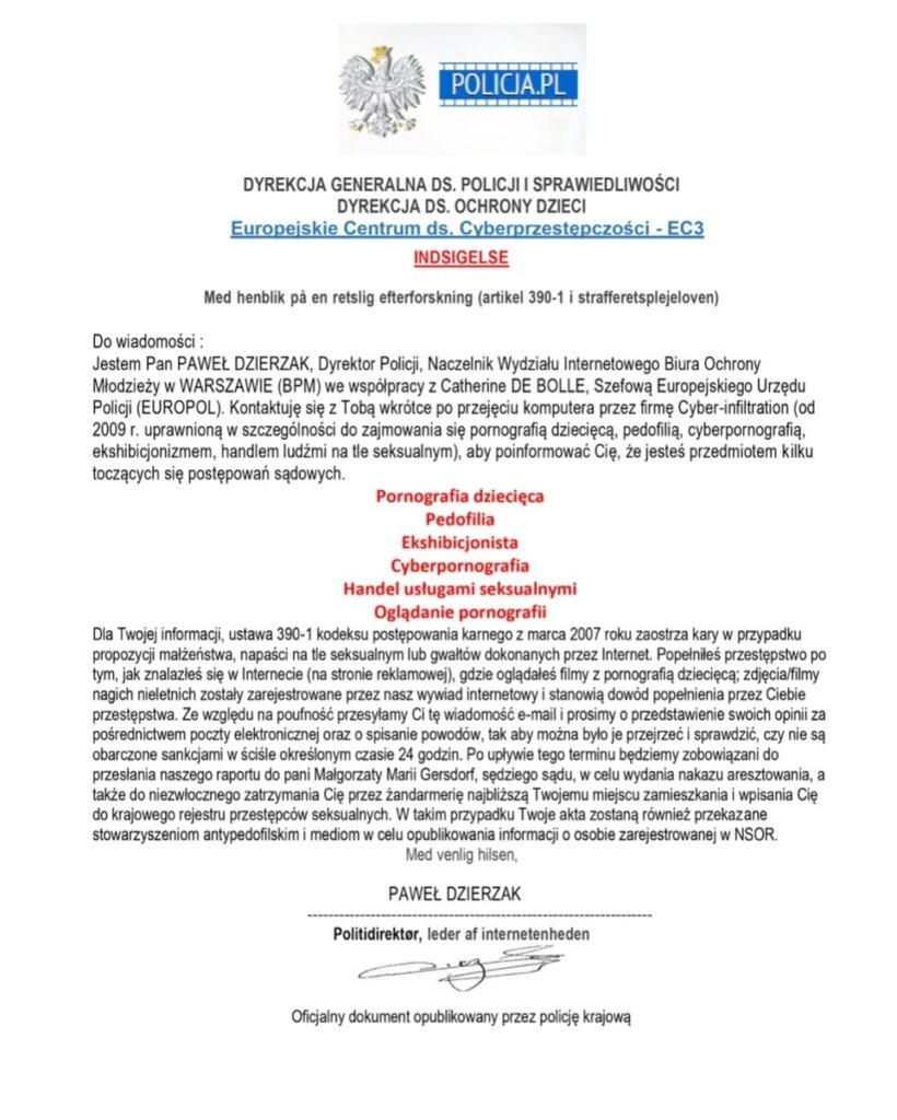 Biuro do Walki z Cyberprzestępczością Komendy Głównej Policji ostrzega przed oszukańczymi wiadomościami przesyłanymi drogą elektroniczną, informującymi o wezwaniu na Policję. Nawiązanie korespondencji z autorem wiadomości może skutkować otrzymaniem plików lub linków, które mogą zainfekować komputer złośliwym oprogramowaniem, wykradającym dane osobowe lub doprowadzić do całkowitego zablokowania komputera. Oszuści żądają okupu za odblokowanie komputera.