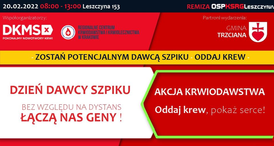 Jednostka OSP KSRG Leszczyna w najbliższą niedzielę organizuje Dzień Dawcy Szpiku oraz Akcję Krwiodawstwa.