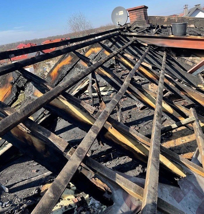 Więźby dachowe uległy praktycznie całkowitemu spaleniu, użyta do ocieplenia wata w całości została uszkodzona, wszystkie pomieszczenia na pierwszym piętrze są nadpalone i zalane włącznie ze wszystkimi meblami i ciuchami. Tak naprawdę z piętra naszego domu w którym mieściły się nasze sypialnie i łazienka nie zostało nic. Podczas akcji gaśniczej a później podczas uprzątania zniszczeń ucierpiała również klatka schodowa i parter, na którym znajduje się tylko salon i kuchnia. Obecnie priorytetem jest jak najszybsza odbudowa dachu, rekonstrukcja spalonej ściany oraz remont piętra, abyśmy znów mogli spokojnie w nim zamieszkać.