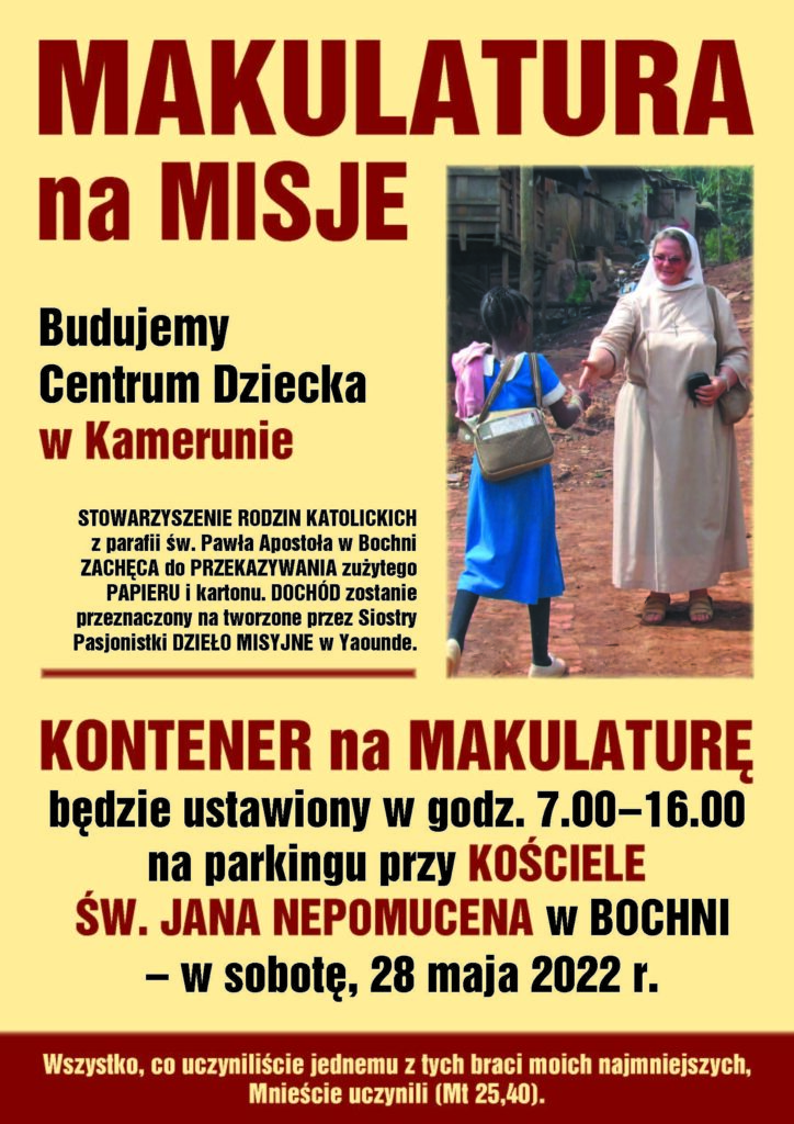 Kolejna akcja „Makulatura na misje” zaplanowana jest dziś przy kościele św. Jana Nepomucena w Bochni. Kontener na makulaturę będzie ustawiony w godz. 7.00 -16.00.