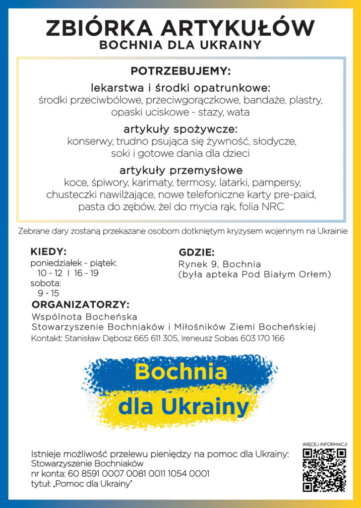 W takiej chwili Polacy pokazują swe wielkie serce. W całym kraju (także w naszym mieście) spontanicznie organizowane są zbiórki darów, przygotowywane noclegi dla uchodźców. Stowarzyszenie „Wspólnota Bocheńska” i Stowarzyszenie Bochniaków i Miłośników Ziemi Bocheńskiej włączają się w tę inicjatywę, chcąc pomóc ukraińskim uchodźcom, którzy znajdują się na granicy, ale też – pamiętając o długoletniej współpracy z domem zakonnym ss. dominikanek w Czortkowie – chcemy z pomocą dotrzeć bezpośrednio na Ukrainę, pokazać jej mieszkańcom, że nie zostali sami. Zapewne nie będzie to łatwe, ale damy radę!